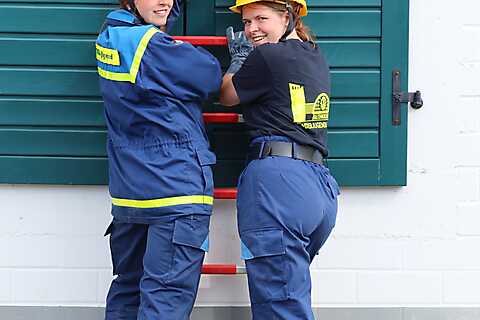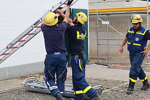 Nach einer kurzen Pause wurde die bunt gemischte Gruppe dann in die Themen des Einsatzgerüstsystem (EGS) und der persönlichen Schutzausstattung gegen Absturz (PSAgA) eingeführt. Nach kleinen Übungen zum Bau von Einspannausleger, Türquerriegel und Anschlagrahmen, endete der erste Tag mit dem Umgang des Auf- und Abseilgerätes.