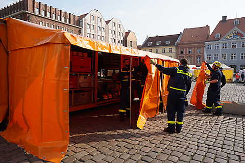 Am 01.04.2017, dem Tag des Ehrenamtes, wurde auf dem Alten Markt im Zentrum der Hansestadt Stralsund, der Aufbau und der Betrieb des Ersteinsatzcontainer Öffentlichkeitswirksam geübt. Der Ersteinsatzcontainer kommt zur Anwendung bei großflächigen Verschmutzungen von Gewässern und gewässernahen Bereichen mit Öl oder ölhaltigen Stoffen. Im Auftrag des Havariekommando Cuxhafen ist der THW OV Stralsund mit Technik zur Ölbekämpfung ausgestattet, die ständig beübt werden muss, damit im Ernstfall keine großen Aufbau- oder Ablaufzeiten entstehen.
